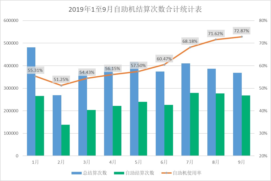 收费窗口工作人员加强宣传、培训,还制作了小视频,宣讲如何进行自助机及微信公众号的使用操作,同时配置了各项服务小工具,譬如手持的指示牌,对讲机,可移动的服务推车等,同时通过专职人员引导,值班长巡视等制度和工作应对高峰期及其他突发状况。经过不懈的努力,两院区自助机的使用率已经从今年1月的55.31%提升到了9月的72.87%。