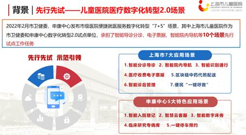 2022年2月,医院按照上海市卫健委、申康中心下发的《上海市“便捷就医服务”数字化转型2.0工作方案》的要求,院领导高度重识,统一部署,成立医院数字化转型2.0领导小组和工作小组,明确门办、医务部、财务部、保障部、保卫部、宣传办、信息部等各部门职责分工和任务时间要求,制定了医院数字化转型2.0工作方案和计划。医院作为市卫健委和申康中心数字化转型场景试点医院,围绕“智慧服务、智慧医疗、智慧管理”三个方面,通过数字化的形式再造,实现对医疗服务价值链的优化、创新和重构,致力于打造儿童智慧友好型医院。于7月底率先完成智能分诊导诊、智能院内导航、智能识别通行、医疗电子票据、智能诊后管理、区块链中药配送、智慧便民急救等七大应用场景以及智能入院登记、智慧云客服、智能数字床旁、临床研究专病库、一键停车预约等五大特色场景示范建设。