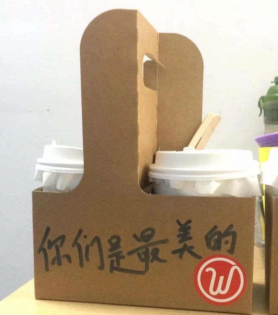 几杯咖啡上还有温馨的留言:“你们是最美的!”、“感谢你们!”、“加油!”等等。