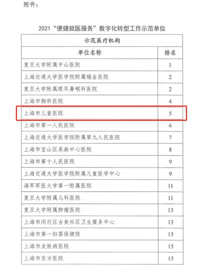 根据《关于开展“便捷就医服务”数字化转型示范区和示范医疗机构评选的通知》要求,经评审,最终确认21家数字化转型示范单位。我院2021年“便捷就医服务”数字化转型工作,一举获得儿科类医院第一,专科医院第三、综合第五的好成绩。