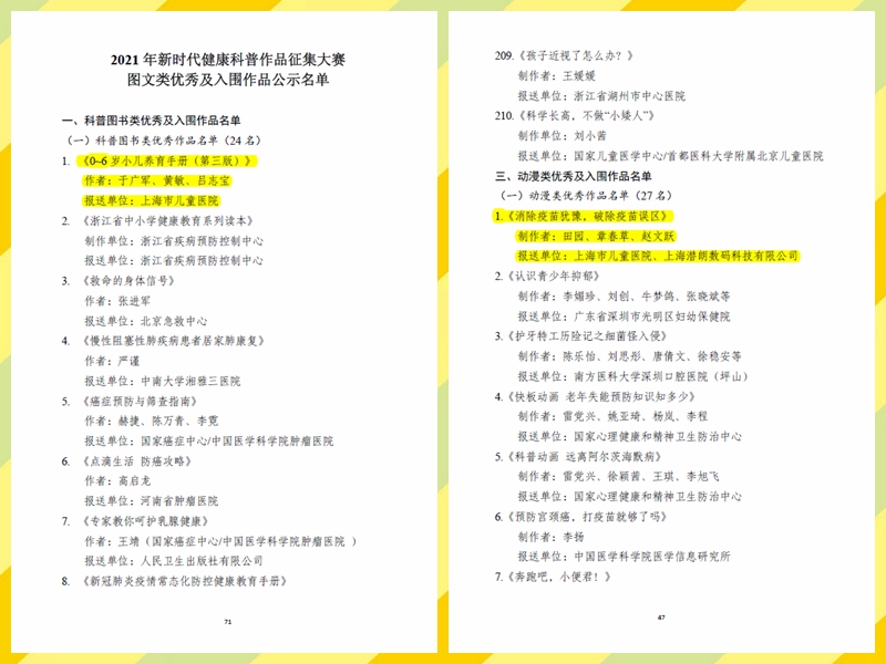 为庆祝中国共产党成立100周年,弘扬以人民健康为中心的理念,落实“我为群众办实事”实践活动和推广健康知识普及,2021年4月起,国家卫生健康委与中宣部、科技部、中国科协共同举办了“健康知识普及行动—2021年新时代健康科普作品征集大赛”。此次大赛共征集到来自全国31个省、自治区、直辖市和新疆生产建设兵团相关单位推荐的12021件作品。经形式审查、省级初审推荐、专家复审及终审,我院报送的科普书籍《0~6岁小儿养育手册(第三版)》和科普系列动画《消除疫苗犹豫,破除疫苗误区》,脱颖而出,分别获评科普图书类优秀作品、动漫类优秀作品。
