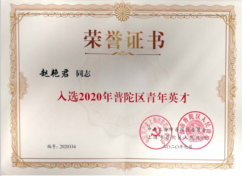 为深入贯彻落实党的十九大精神,着力培养和集聚一批具有引领带动效应的高层次人才,全面提升人才能级和核心竞争力,促进区域高质量发展,普陀区人力资源和社会保障局人才办开展2020年普陀区青年英才评选工作。通过选拔和推荐,我院儿保科赵艳君主治医师最终荣获“普陀区青年英才”荣誉称号。