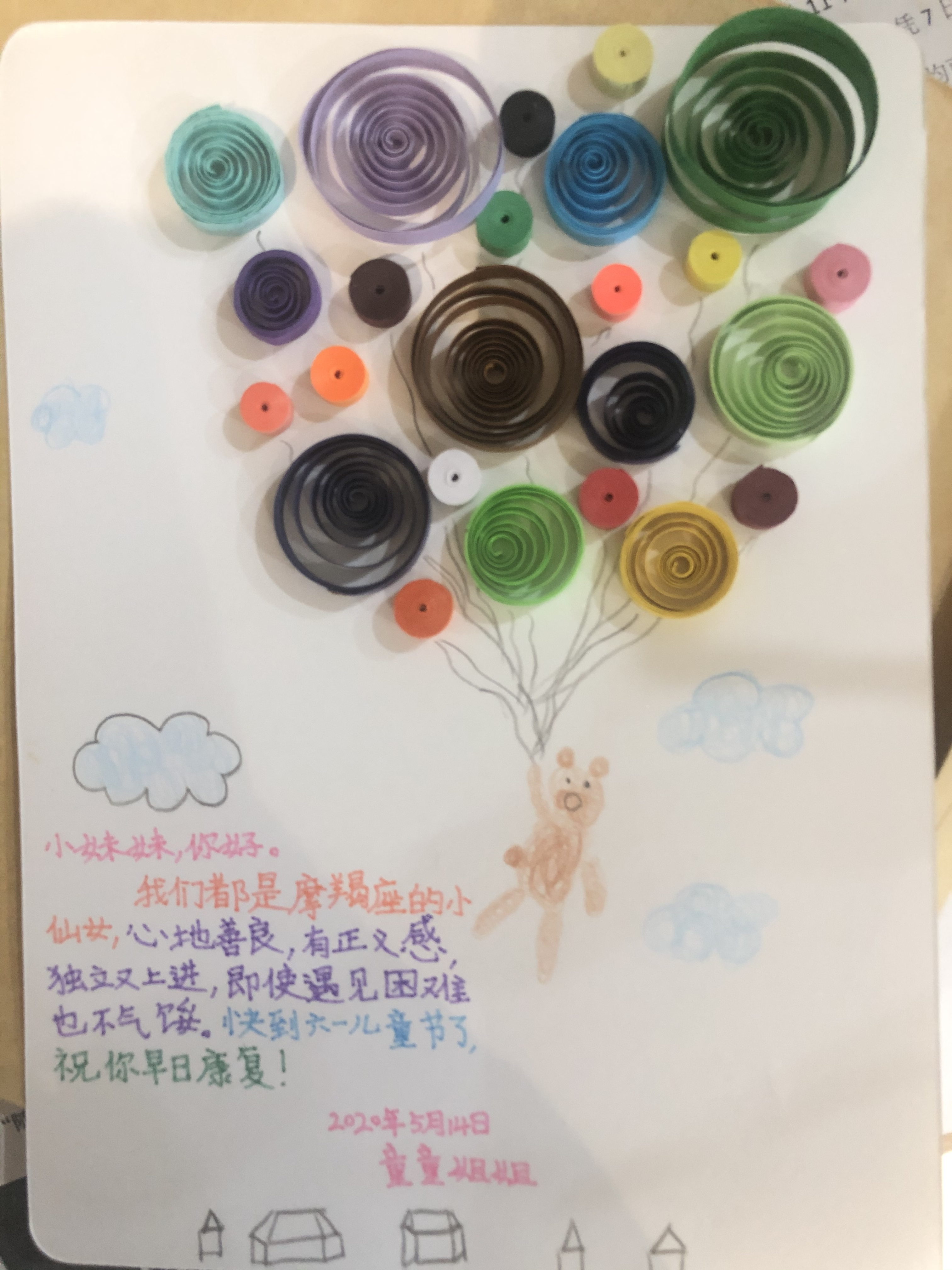 “亲爱的宝贝儿,阿姨知道你生病了可能会不舒服,但你是一个坚强的小朋友,一定会好好吃饭,听爸爸妈妈的话。”、“小妹妹你好,我们都是摩羯座的小仙女……即使遇见困难也不气馁!”令人感动的是,这位来自北京的干细胞捐献者和她的女儿分别制作了两封情真意切的贺卡,连同干细胞一起带给了素昧平生的快快。她们表达了对千里之外的快快的祝福,也祝愿她六一儿童节快乐,早日康复。