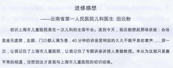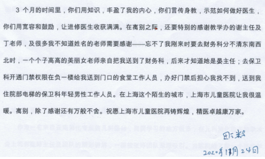 近期,教学办公室收到了一份特殊的进修感想,这封感想来自在我院消化感染科进修的田云粉医生。三年前,田医生刚刚担任云南省第一人民医院住院医师规范化培训的儿科基地秘书,因为之前从未接触过住培管理工作,对住培政策也不太了解,工作开展毫无头绪,曾有过一段时间的迷惘。通过参加上海市儿童医院主办的住培培训班和教学工作坊,让她不仅找到了开展住培工作的方向,而且学习到如何制定考核制度,有序安排教学活动,医院的住培工作自此开展的有声有色,所以当有了进修机会,她毫不犹豫的选择来到上海市儿童医院继续学习。在进修期间,她多次表达“来对了,收获真的很大”,感叹消化感染科团队细致、精准、温暖、全面的工作精神,即将结业之时,又自发写了一份两千多字的进修感想,通过文字表达了对科室及医院的感谢。