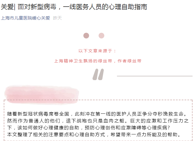 抗击新型冠状病毒肺炎疫情,需要精湛的技术,更需要细致的持之以恒的耐心和坚定执着的信心。医院关心一线员工心理状态,组建心理咨询志愿者团队,给予必要心理支持。与上海市精神卫生中心合作,推出《一线医务人员的心理自助指南》做好心理健康的自助工作,预防心理创伤和应激障碍等心理疾病。