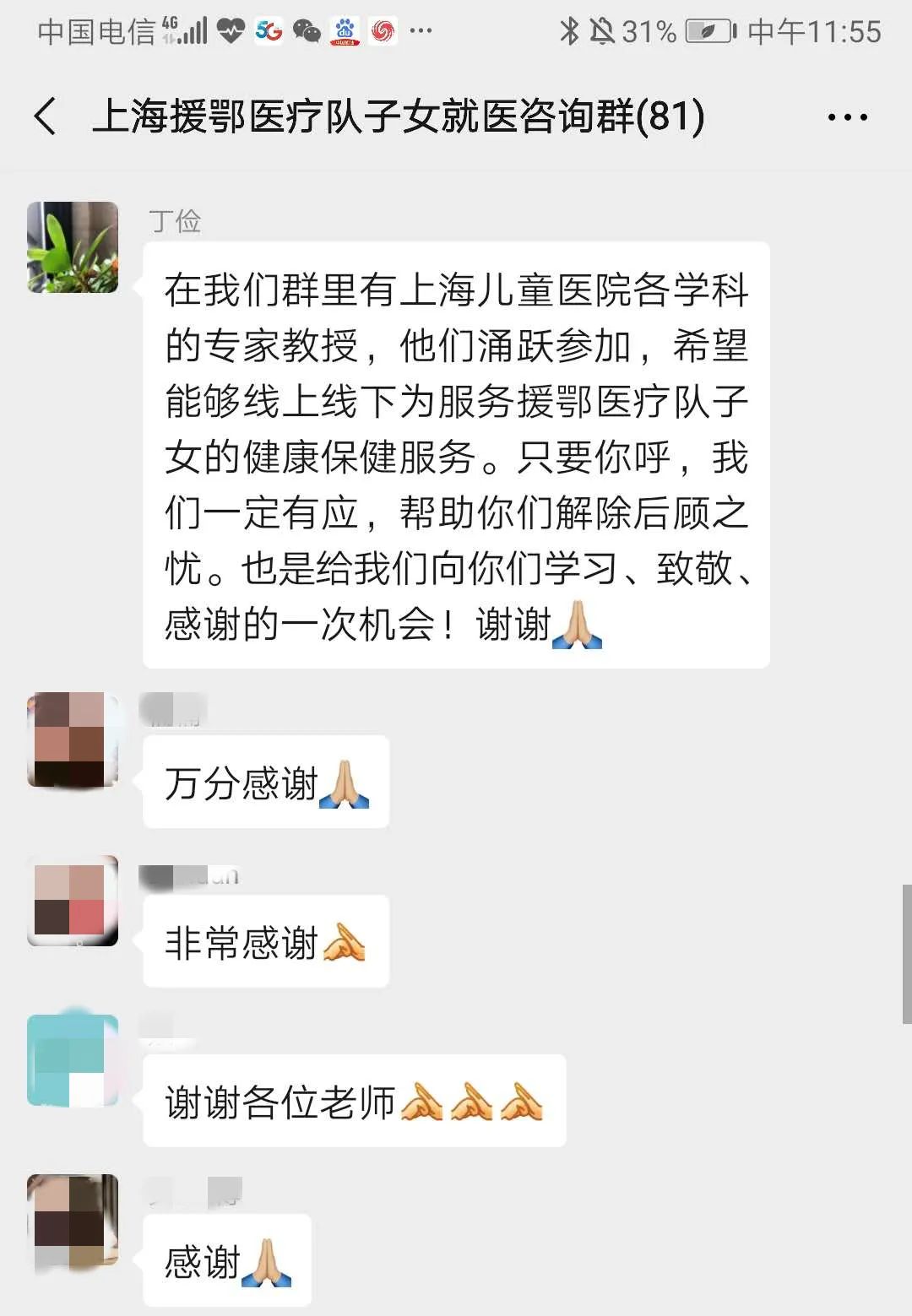 后方稳定,前方稳心。考虑到援鄂医疗队子女可能的就医和健康需求,医院决定开通“上海援鄂医疗队子女就医关爱热线”微信平台,由医院各科室副主任医师及以上的党员专家、入党积极分子组成“后援团”,为上海援鄂医疗队的子女提供坚强的医疗保障。热线开通短短3个小时,就有43名援鄂医疗队队员或者其家属来添加关注,医院临床党员专家也积极参与,骨科主任应灏、内分泌科主任李嫔、泌尿外科主任谢华、皮肤科主任钱秋芳、儿保科主任陈津津等30多位专家报名参与。儿童医院将通过线上专家问诊,线下专人对接诊疗的方式,为前方的白衣战士解除后顾之忧。