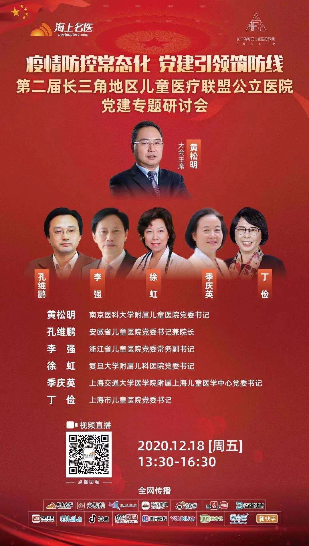 12月18日,第二届长三角地区儿童医疗联盟党建研讨会顺利召开,本次研讨会采用线上直播方式,由我院主办,南京儿童医院、浙江省儿童医院、安徽省儿童医院、复旦大学附属儿科医院、上海儿童医学中心共同参与,一起探讨在新冠疫情防控常态化背景下儿童医疗机构党的建设新思路、新机制和新方法,会议在海上名医支持下首次全网直播,央视频、微博、科普中国、医会宝等平台同步播放,累计39万人次观看。