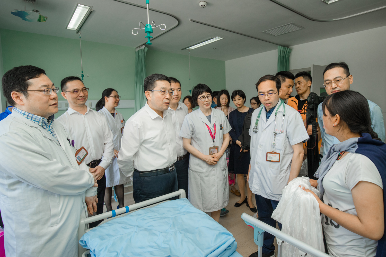 6月4日上午在我院泸定路院区,市委常委、统战部部长郑钢淼一行来院看望慰问“书香中梁”日喀则先心病儿童救治公益项目患儿及家属,详细了解该项目的开展情况。上海申康医院发展中心党委副书记方秉华、中梁控股集团高级副总裁徐忠信、上海星舍公益基金会理事长吴智亮、我院党委书记丁俭、院长于广军等相关同志陪同探望。