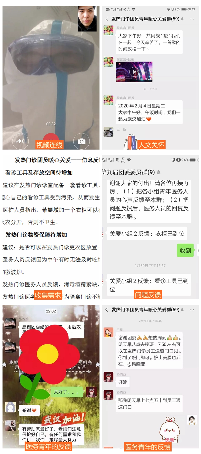为关心在发热门诊一线奋战的青年医务人员们,院团委第一时间制定了《关于关爱发热门诊医务青年的工作方案》,9名团委委员精准对接第一批进入发热门诊的36位青年医务人员,通过建立微信群,利用每天用餐时间视频聊天的方式,及时了解他们的思想状况和面临的困难需求,梳理总结并反馈给医院员工关爱工作组,尽一切可能保障好发热门诊青年医务人员的实际需求。
