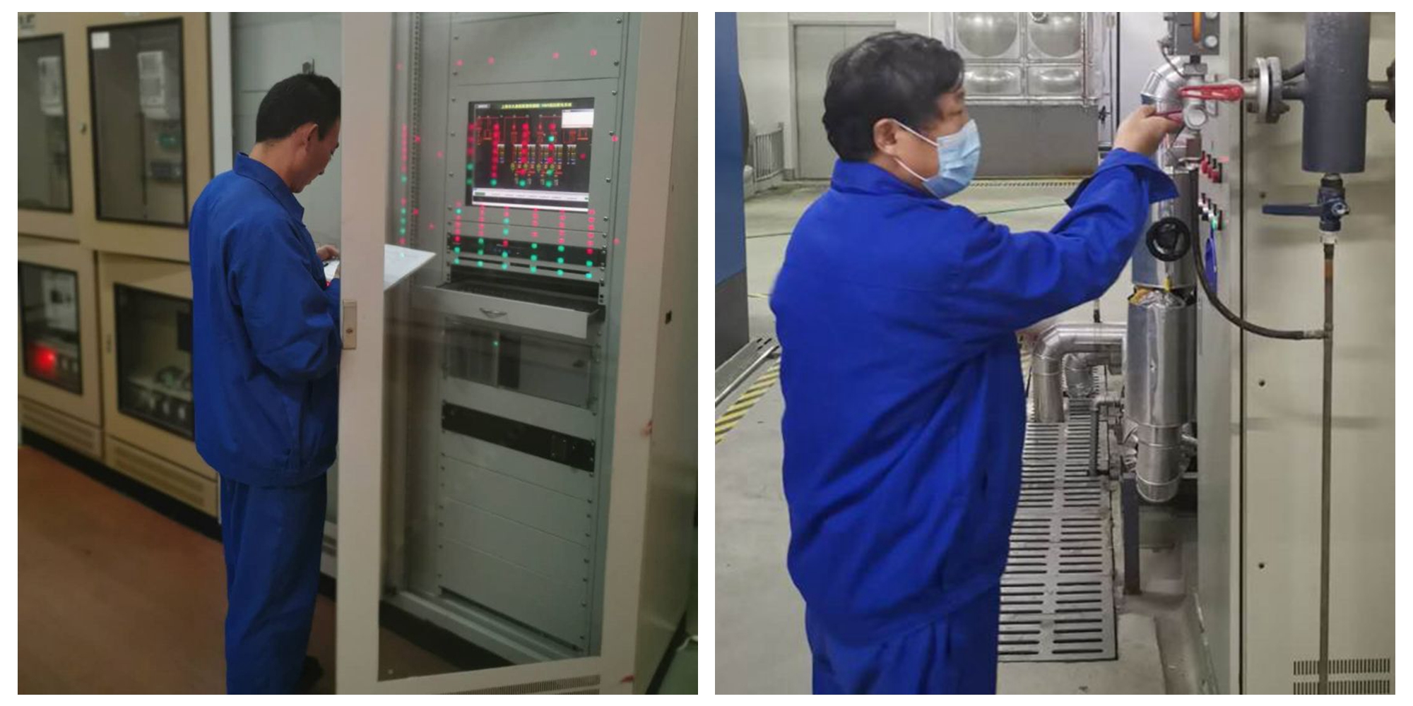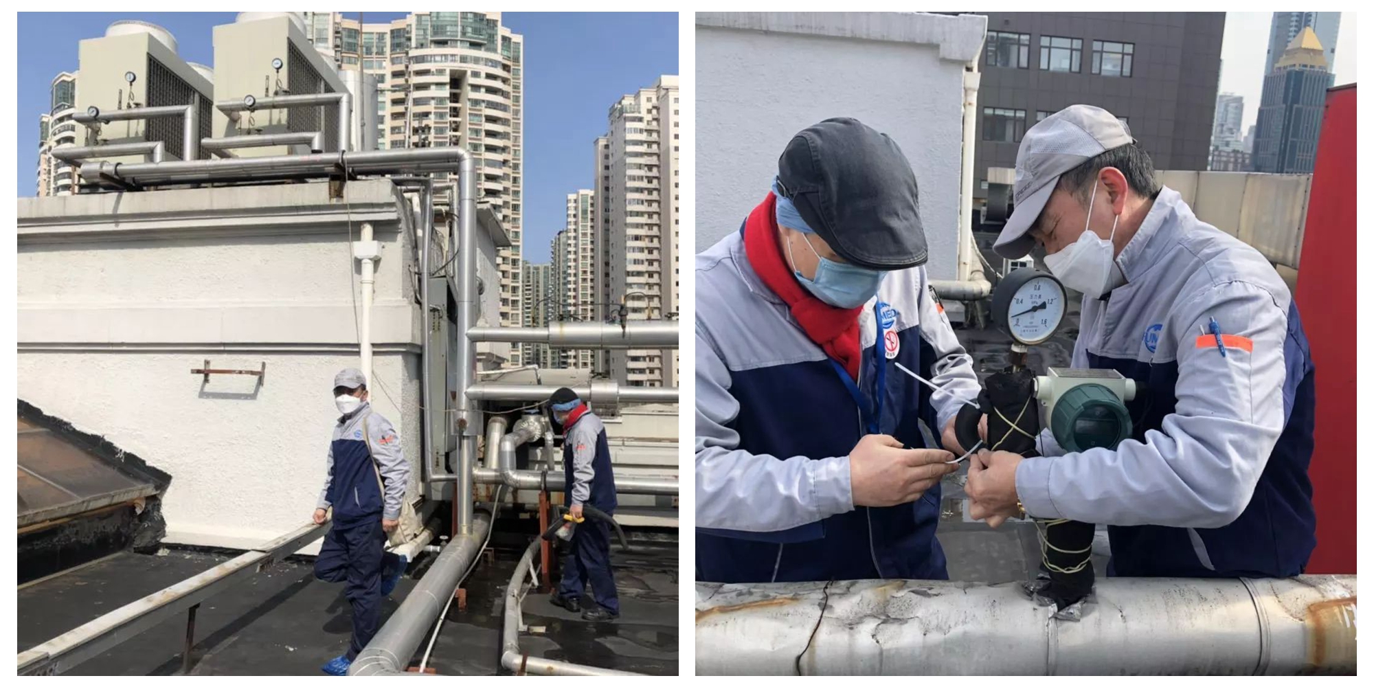 泸定路院区物业项目部值班人员带领工程组在寒潮来临前对工程班组重点设施设备进行检查,确保寒潮期间医院的设施设备安全运行,并对空调外包单位进行督查,确保空调温度正常。