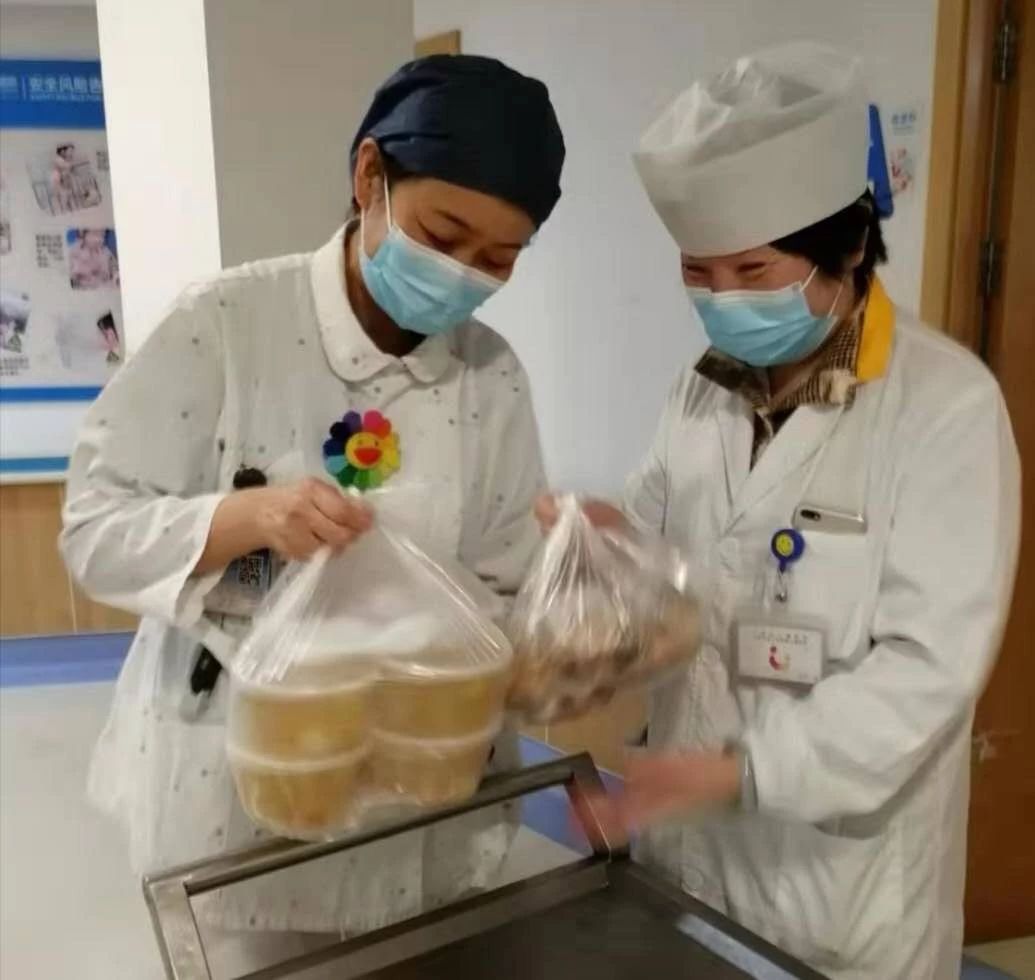 疫情期间遇上寒流来袭,北京西路院区食堂送“暖心甜汤”给一线员工,让他们暖心暖胃。泸定路院区食堂持续供应免费的红糖姜茶,为寒冬里工作的医护人员带去温暖。为保证各位医护、后勤人员的用餐需求,食堂的午餐、晚餐分别延长半个小时。同时开放了夜宵供餐,每天食堂夜宵开放到夜里9点。有时因为工作繁忙,部分医护人员晚9点以后也有用餐需求,接到订单,食堂也会尽力满足,延长供餐时间。