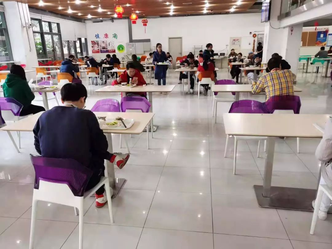 食堂的工作人员每日进行体温测量,若发现异常令其就医检查,并提醒员工如有任何不适症状必须及时上报。所有在岗员工供餐服务期间必须规范佩戴口罩,岗前洗手消毒,岗中不交头接耳,任何情况下注意手卫生,及时洗净双手并消毒,规范佩戴手套。严格把控员工卫生健康状况,保障供餐服务的安全。同时提醒就餐员工单个就坐,“错位就餐”,我们的员工也戏称“又找回了高考的感觉”。