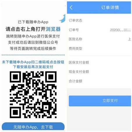 6、点击“去支付”后,会提示患者打开已安装的“随申办”App(患儿家长注册),然后进行医保在线支付结算。