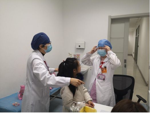 院领导为内分泌科门诊的李妍医生送上护目镜,并叮嘱务必做好个人防护