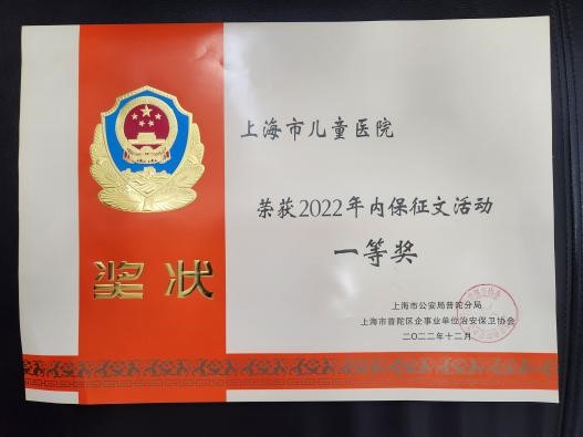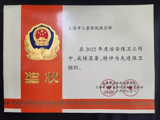 2022年12月,上海市公安局治安总队、上海市企事业单位治安保卫协会组织先进单位和个人评选,我院荣获2022年度上海市企事业单位“治安防范先进集体”“疫情防控工作先进集体”称号和“内保征文活动一等奖”,保卫部荣获“先进保卫组织”。