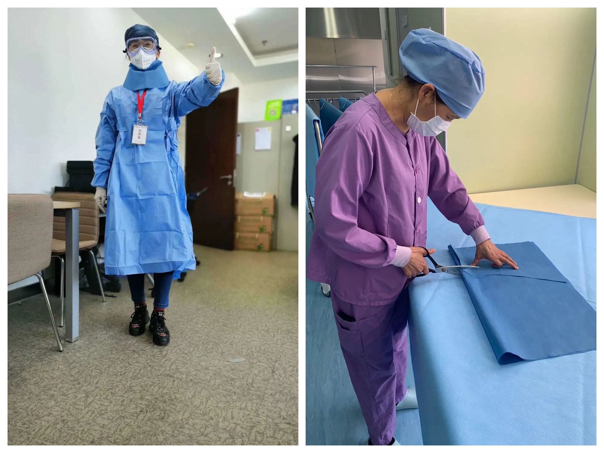 疫情之下,部分医护人员在做可能发生气溶胶或喷溅操作时所做的防护措施,不能保护到他们裸露在外面的脖颈。幸而一群心灵手巧的“儿医裁缝”们制作了一款一次性简易保护围脖,既能保护脖颈,预防感染发生,佩戴操作又简便。