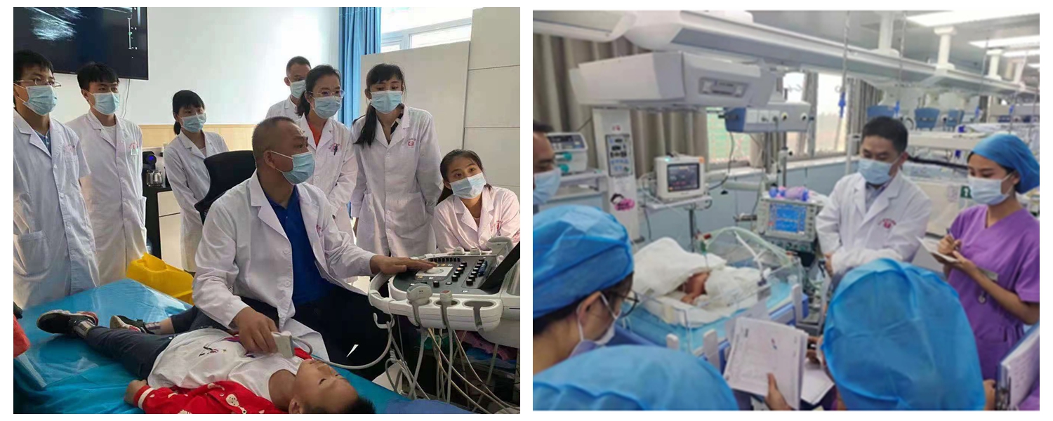 超声科主任许云峰(图左)、新生儿科副主任蔡成(图右)在科室进行业务指导
