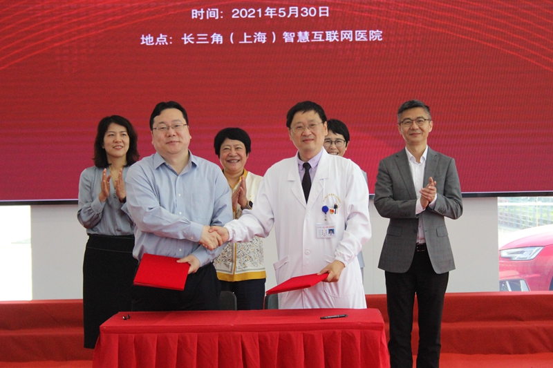 5月30日,在长三角(上海)智慧互联网医院门诊大厅,上海市儿童医院与青浦区朱家角人民医院在青浦区委书记赵惠琴、区委副书记杨晓菁、区卫健委主任饶斐文、市儿...
