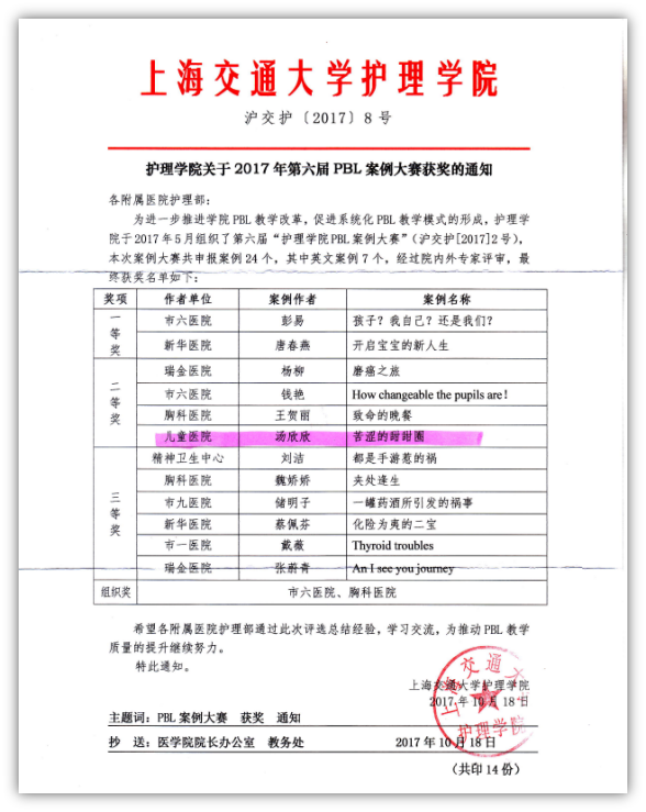 我院普外科护士汤欣欣在2017年上海交通大学护理学院举办的第六届 PBL案例大赛中荣获“二等奖”。