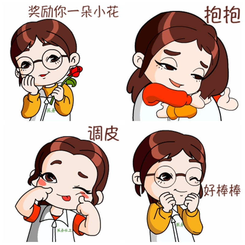 2019年,该院推出了具有高识别度的社工卡通形象,深受患儿和家长欢迎,在此基础上今年医院又推出了表情包,其中有给患儿点赞、拥抱、安抚等萌萌哒的动作。据儿童医院社工部主任钮骏介绍,卡通形象的推出是以符号互动理论为基础,当孩子们看到社工的卡通形象,是彩色的、可爱的,就可以让孩子对医务社工有另外一种理解。表情包的推出也将拉近医务社工与服务对象的距离,以专业服务儿童,让更多家庭有获得感,提升民众对社会工作专业服务的知晓率。